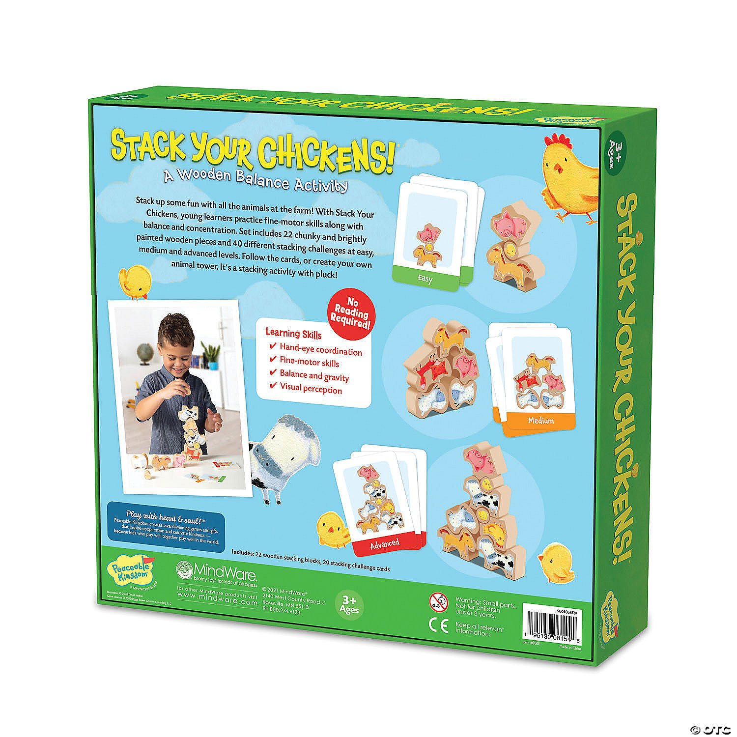 One, two, three…how many pieces can you stack before they tumble free? Boost hand-eye coordination in this kids’ activity that can be made more challenging as players improve their fine motor skills! Choose your level (easy, medium or advanced), grab a stacking challenge card to follow and get to work balancing the chunky, brightly colored wooden pieces on top of each other! Or let your creativity run free by constructing your own tower. Either way, you’ll be working on balance and visual perception while having fun with farm animals! Includes 22 wooden stacking pieces and 40 stacking challenges.• Simple building planks put open-ended STEM play right in kids’ hands• Kids gain first-hand experience with balance, gravity and visual perception• No glue or extra supplies needed: just unpack and play• Sturdy, long-lasting, and easy to store• Use stacking challenges for building inspiration, or create your own designs