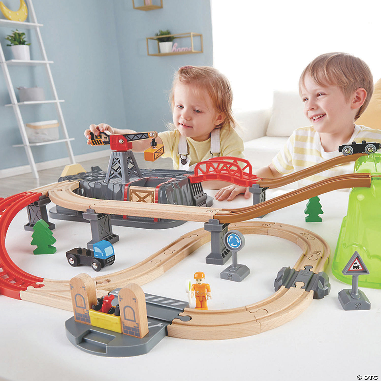 Kids will build a complete wooden train track with working crane, passengers, cargo, and more. This set includes everything you need for a full track and complete construction yard. With over 50 pieces, this set is the only one you’ll need to get kids having fun right away. Full of thoughtful details, this collection makes “let’s get a train set” easy and affordable! No need to buy multiple packs to complete your experience. Every piece has a purpose; the storage box becomes a green mountain pass, and the lid converts to a tiny town. This is a simple, classic toy re-imagined to maximize delight, and it’s won the awards to prove it.• Includes 1 free-wheeling locomotive, 2 carriages, 2 S-rails, 8 curved rails, 4 straight rails, 2 irregular rails, one mountain-shaped rails, pine trees, leafy trees and much more• Encourages imagination, problem solving, motor skills, and creative play• Dimensions: L: 19.7″, W: 31.5″; H 5.5″