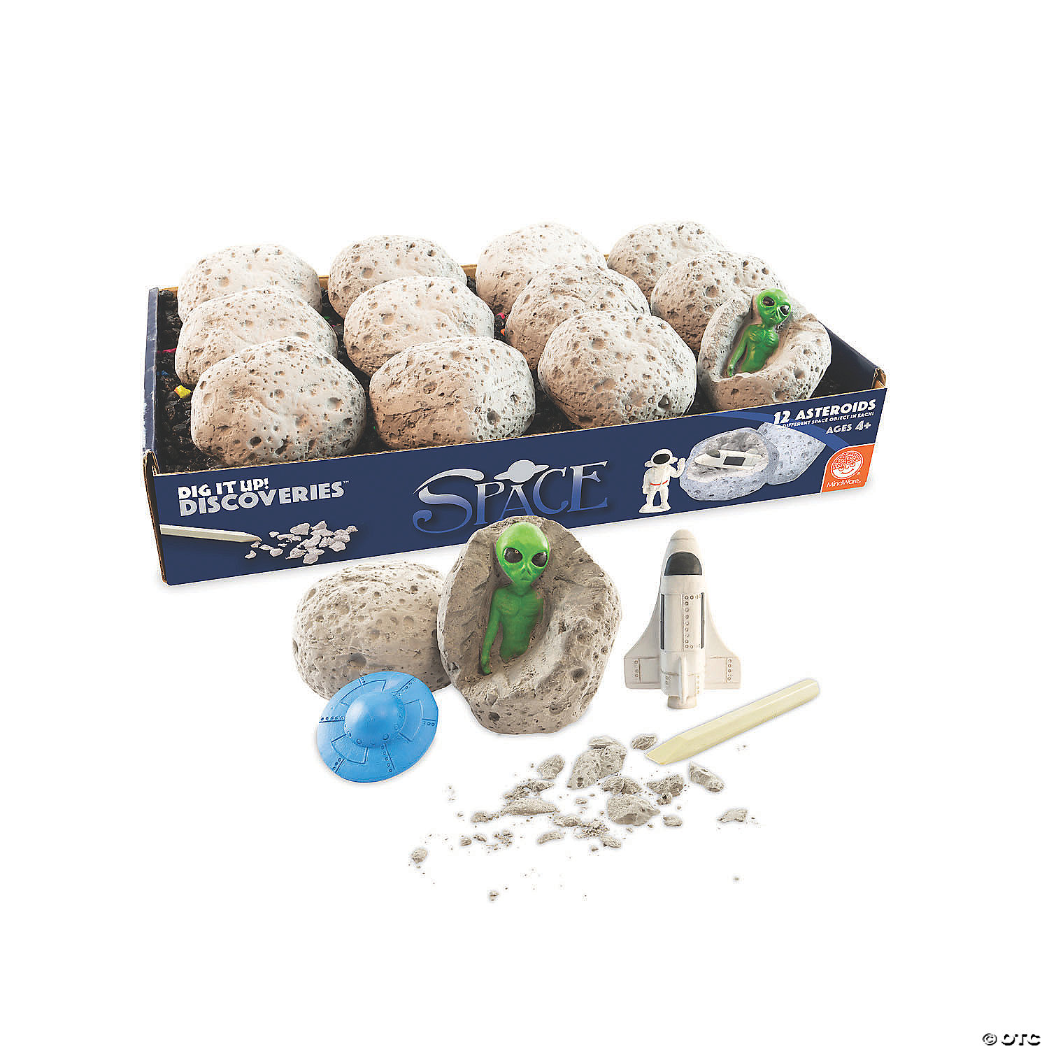 Uncover 12 amazing space objects inside 12 asteroids! Once excavation is complete, learn about each unique object, from a UFO to an astronaut, using the exploration guide. Simply soak the clay asteroid in water, then carefully chisel away the sedimentary material to reveal the out-of-this-world toy inside. ⢠Each asteroid contains a different object from outer space⢠Helps promote an early interest in science and imagination for kids⢠The perfect activity for parties and groups ⢠12 asteroids, chiseling tools and instructions