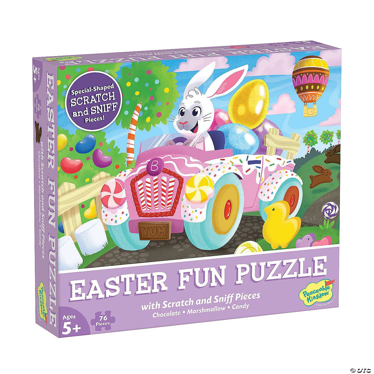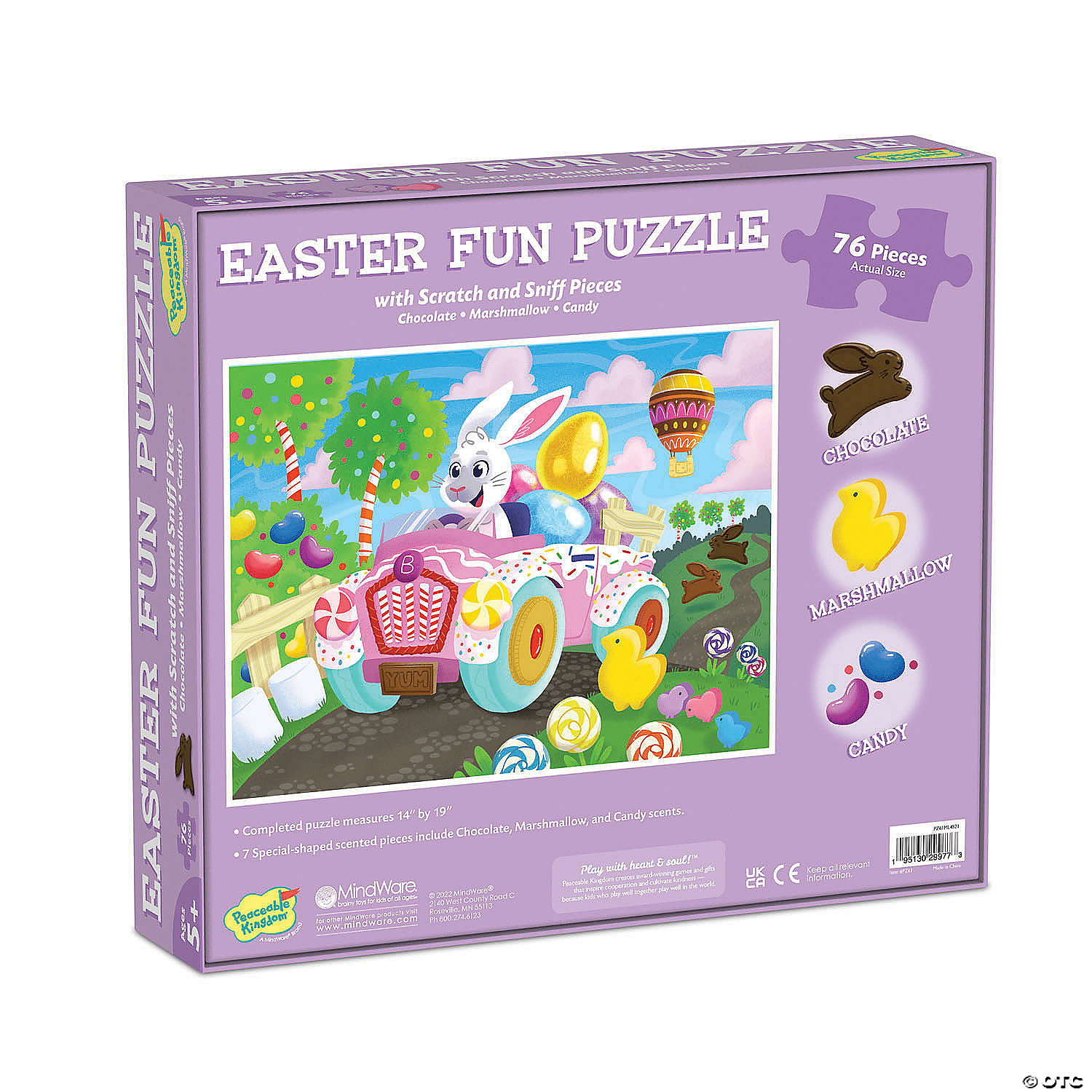 Scratch the 7 scented pieces of this Easter fun puzzle to release favorite holiday aromas of chocolate, marshmallow, and candy. Then arrange all of the pieces into a colorful Easter inspired scene. The thick, durable pieces are easy to handle and allow for long-lasting play year after year!• This scratch-and-sniff Easter puzzle looks as good as it smells!• Develops visual recognition, cooperation, fine motor development, problem solving and cognitive skills• Includes 76 pieces• Completed puzzle measures 14” x 19”