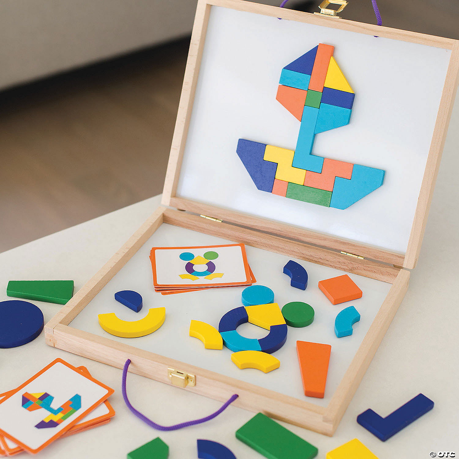 Boost your children’s fine motor and visual-thinking skills with geometric magnet play! This building toy features numbered pattern cards that increase in difficulty, ranging from beginner to expert. As patterns become more challenging, kids gain patience and confidence through trial and error. Or enjoy hours of imaginative free play! Includes 42 brightly-colored, solid wooden magnets for replicating any of the 50 full-color puzzles such as animals, faces, vehicles, flowers, structures and more. The magnetic surface doubles as a dry-erase board that can be decorated with your own dry-erase markers.• Colorful magnet shapes for uninhibited pattern fun• Pattern cards stretch the brain as kids duplicate the images, ranging from beginner to difficult• Magnetic surface doubles as dry erase board for doodle play