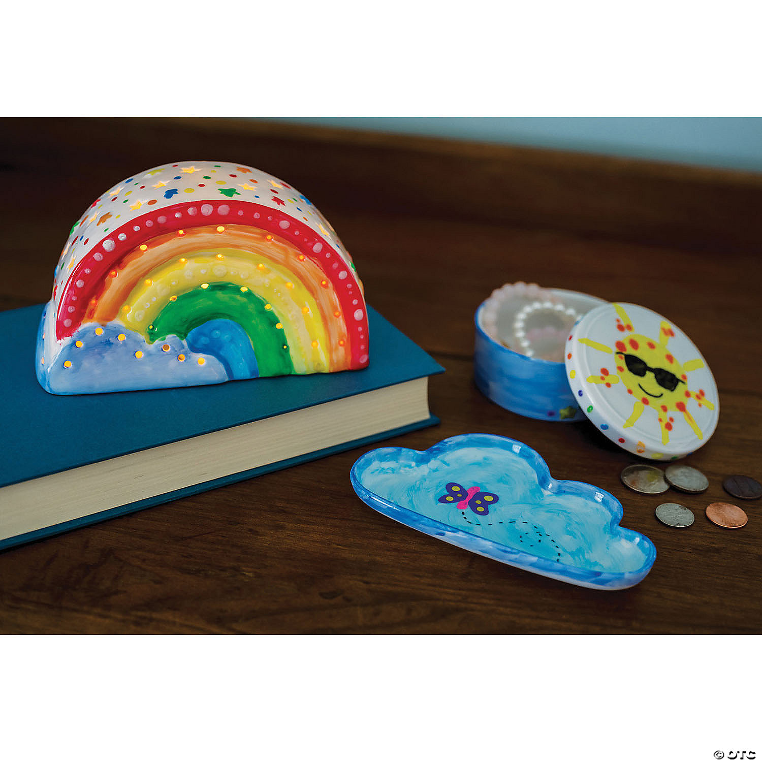 Paint Your Own Rainbow Décor has everything you need to create unique bedroom, office or home decorations…just add a touch of your own creativity! Featuring paints, a paintbrush, a rainbow light that can serve as a beautiful DIY nightlight, a jewelry dish, a trinket tray that’s just right for holding coins and other treasures and a colorful suitcase presentation, this kit makes a great gift for rainbow lovers.• Develops creativity, hand-eye coordination, color-mixing and fine motor skills• Paint and bake for a personalized, functional craft you can display for all to enjoy.• Use for your next family project, at the next play date or as a gift• Includes 12 paints, 2 paintbrushes, a rainbow light, tea light with batteries, a jewelry dish, a trinket tray, a colorful suitcase presentation and a painting guide.Age Recommendation: Ages 8 and up