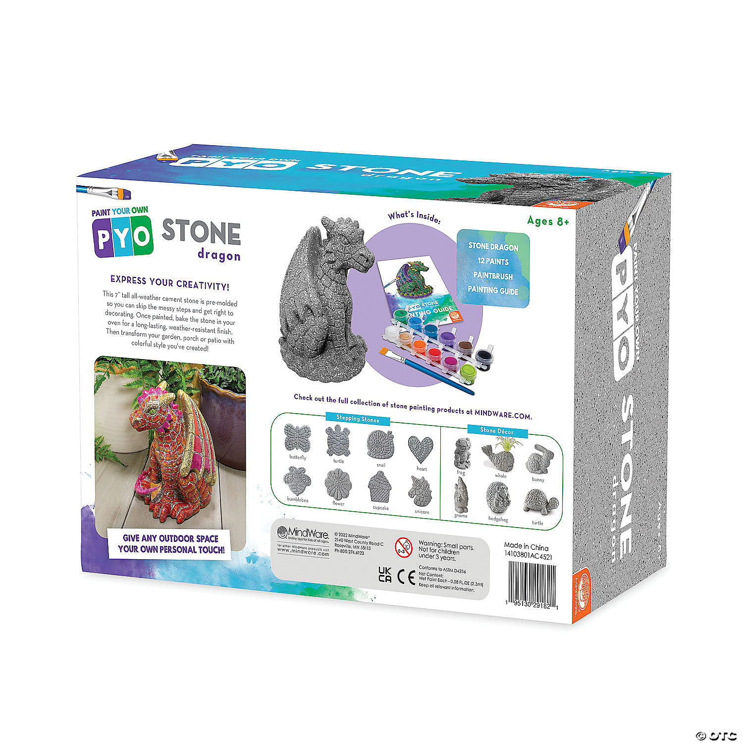 These Paint Your Own Stone Decorations are fun art projects for kids and adults alike! Create your own whimsical, hand-painted stone décor that’s just waiting to leap onto your porch, patio or deck. There’s no need to fuss over cement mixing or messy prep work; this stone dragon is ready to paint, right out of the box. Vibrant paints encourage mixing, blending and special effects as well! Once your dragon is painted, bake it in the oven for a long-lasting, weather-resistant finish.• Decorate your outdoor living space with this inspiring, simple craft• Develops creativity, hand-eye coordination and color mixing skills• 7” tall stone dragon, 12 paints, paint brush and instructions• Printable color planning template