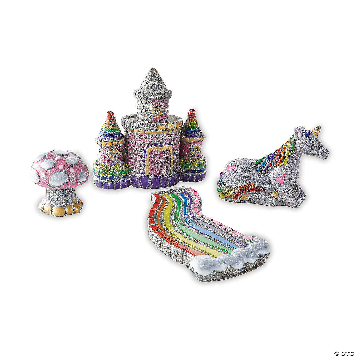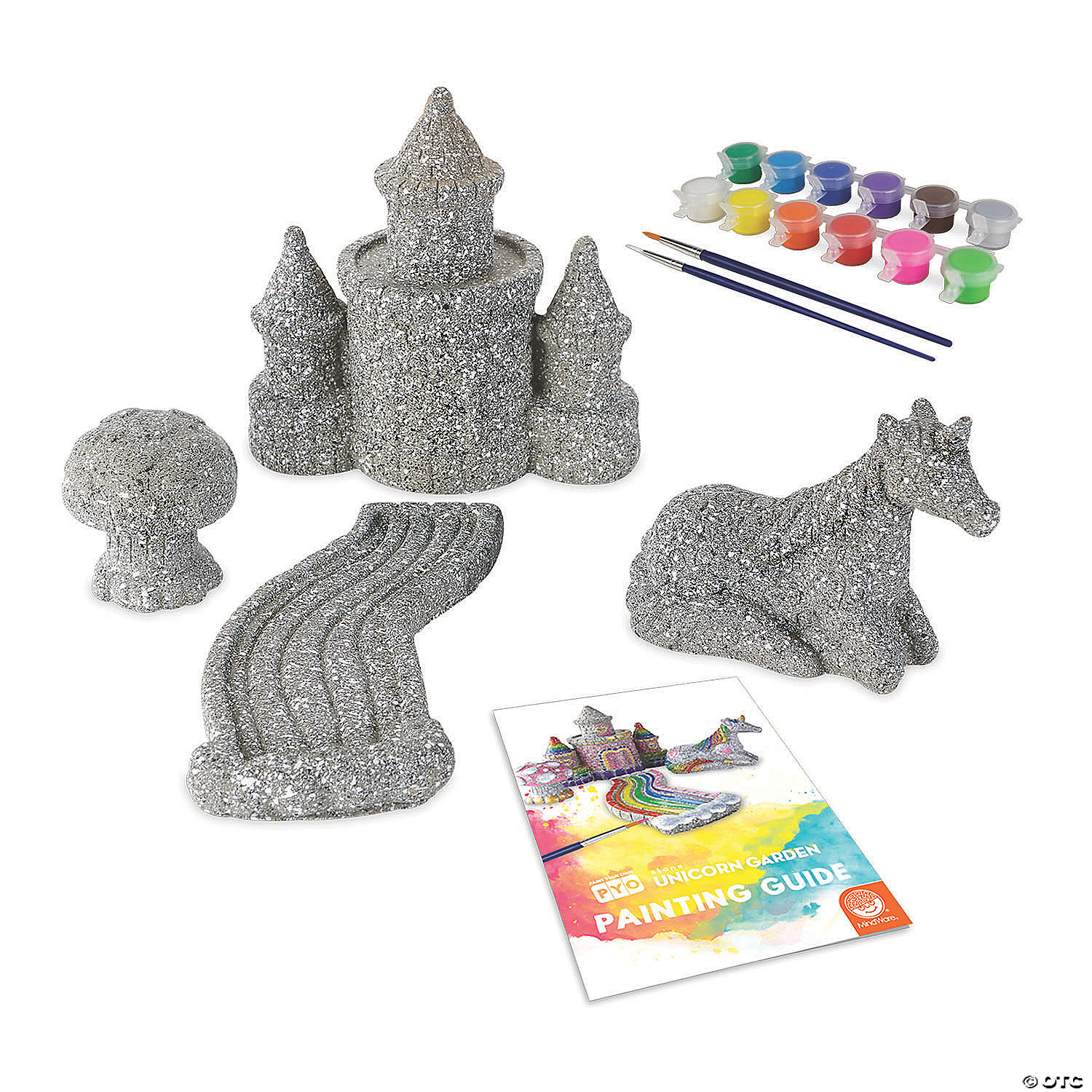 Create an exciting, magical Unicorn land with these Paint Your Own garden accessories! This set of all-weather cement stone figurines is pre-molded so you can skip the messy steps and get right to decorating. Once painted, bake the stones in your oven for a long-lasting, weather-resistant finish. Display your colorful creations in a flower bed, at the base of a tree, in a container or even indoors. Includes stone unicorn, mushroom, path and castle, 12 paints, 2 paintbrushes and painting guide.