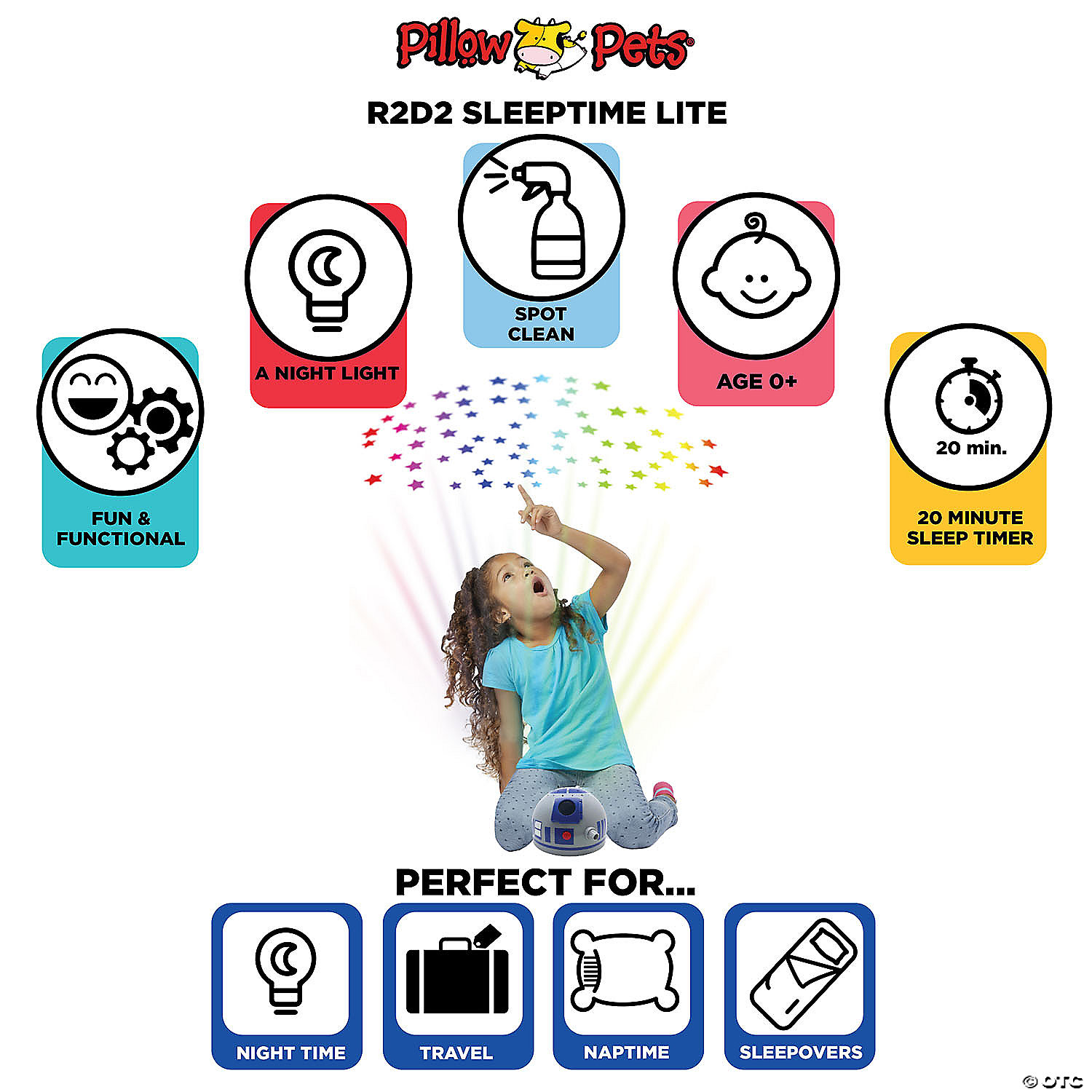 Pillow Pets presents this cute nightlight that shines colorful rainbow stars onto your ceiling! This Star Wars R2D2 Sleeptime Lite starts out as a fun pal to play with and then becomes a soothing nightlight. Easily turn your child’s bedroom ceiling into a starry night sky with the touch of a button that projects rainbow color lights that can be set to change slowly or quickly. It also has a built-in timer that will automatically shut the light off after 20 minutes, giving little ones enough time to drift off to sleep.R2-D2 NIGHTLIGHT: After you’ve saved the galaxy, you can sleep soundly with the R2-D2 Sleeptime Lite, a light projector that looks like everyone’s favorite droid from the Star Wars series. Add it to your Star Wars collection!NIGHTTIME COMPANION: Pillow Pets presents super cute, soft, & adorable characters that project colorful stars at night. Toddlers, kids, teens, & adults love classic & collectible critters.STARRY COMFORT: This nightlight is a pal by day and a soothing light projector by night! It’s a comforting travel friend for any child on road trips & airplanes. Also use as boy & girl bedroom decoration.BEST BUDDY: Children of all ages will love this original toy for play & as a companion for reading, watching television, studying, and sleepy nap time. Youth love to read with this cozy creature.SPECS: Official Pillow Pets & licensed Disney Star Wars item. BPA & Phthalates free. Size: 11in. Surface wash only. Projects light with 3 color modes and 20 min timer. Ages 3+. Warning: Choking Hazard. Small parts, not intended for children under age 3. Special Shipping Information: This item ships separately from other items in your order. This item cannot ship to a P.O. Box. This item may be subject to additional processing days. ITEM IS NOT ELIGIBLE FOR EXPEDITED SHIPPING You may initiate a return for unused items within 30 days, if the items are in original packaging with all original materials included with the shipment.”