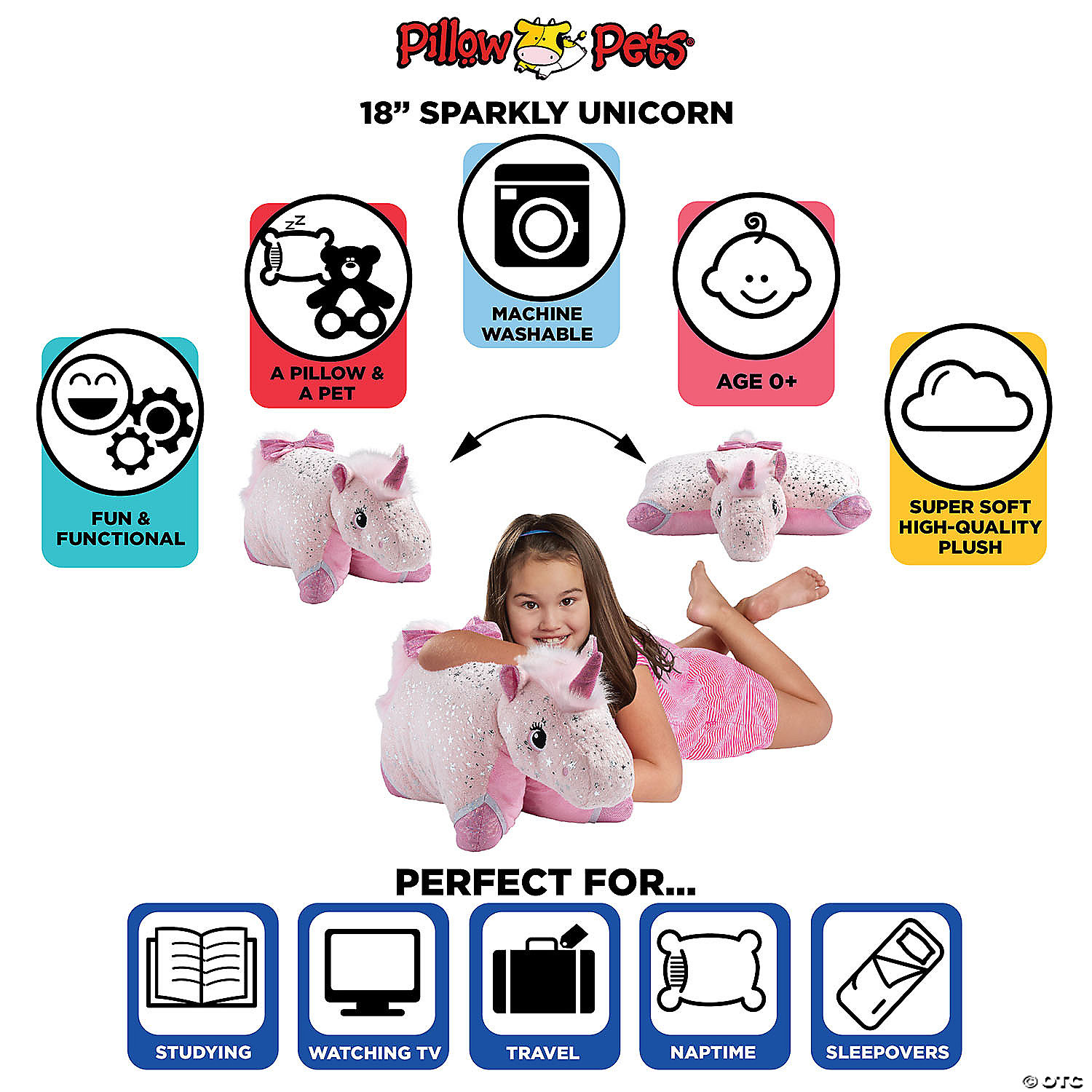 Fans of sparkles and glitter will love our newest pink unicorn! Silver star fabric that sparkles and shines – this Sparkly Unicorn is extra special: she’ll leave a sparkle wherever she goes! Get tons of warm snuggly happiness and cuddle up every day and night with the Pillow Pets Sparkly Unicorn. The plushest, comfiest and softest stuffed animal you will find. Kids of all ages will have fun playing with this special Sparkly Unicorn during the day, and then snuggling with it for reading, watching television, or studying with friends. Ideal for rest time and fun time – not to mention a comforting partner on road trips or airplane rides. Starts out as your pal, then unfasten it and use it as a pillow! CARE: Wash on gentle cycle and cold water placing your Pillow Pet inside a white pillow case and tying off the open ends to prevent damage during washing and to maintain plush. Do not put in the dryer.SPECIFICS: Official Pillow Pets product. Made of high-quality washable plush fabrics. BPA-free and Phthalates-free materials. Opens to an 16inch flat stuffed pillow. All sizes are approximate. Ages 0+. Special Shipping Information: This item ships separately from other items in your order. This item cannot ship to a P.O. Box. This item may be subject to additional processing days. ITEM IS NOT ELIGIBLE FOR EXPEDITED SHIPPING You may initiate a return for unused items within 30 days, if the items are in original packaging with all original materials included with the shipment.