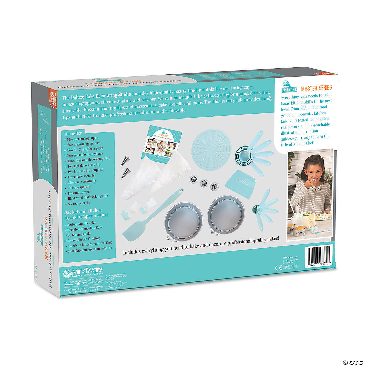 Plan, bake and decorate your own cakes for birthdays, holidays or just for dessert! All contents are perfectly sized for smaller hands and are easy to clean. The 2 types of decorating tips and 6 recipe cards give kids the creative tools to test different combinations and designs for their cakes, all while exercising fine motor skills and concentration. The Playful Chef Cake Decorating Kit will make sweet, successful memories for young pastry makers. • Build real-life skills such as recipe following and doing things for others• Safe, rewarding, delicious projects for kids • Offers an introduction to the simple craft of decoration• Provides a sweet way to encourage concentration, patience, and a try-again attitude• Includes 2 springform pans, 2 reusable pastry bags, 4 decorating tips, 3 cake stencils, cooking instruments needed to bake and frost cakes, 6 recipe cards and instructionsRecommended for Ages 8 and up.