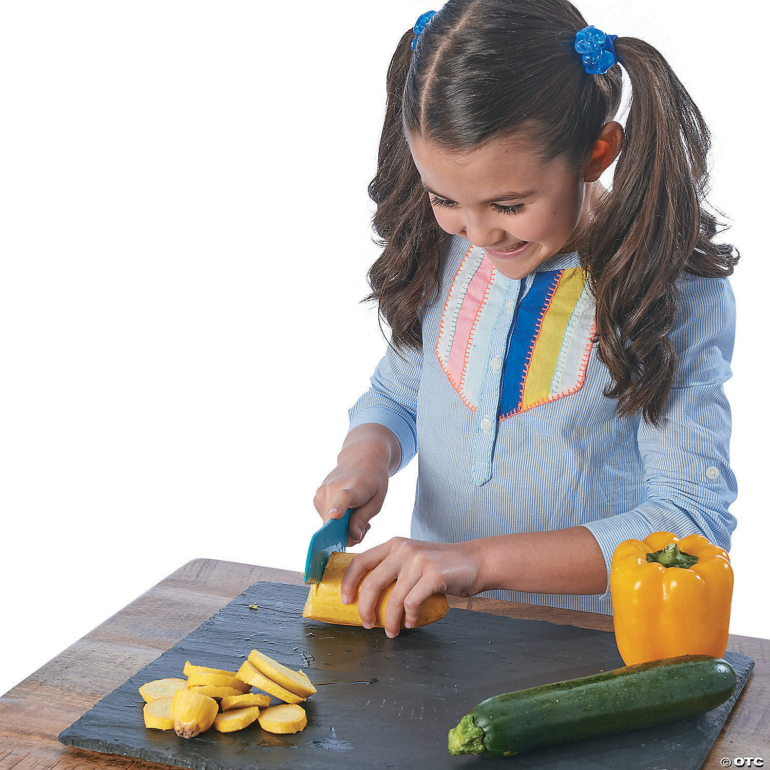 Designed with safety first, these specially-engineered knives let kids do something they usually aren’t allowed to – cut food in the kitchen! The serrated edges saw and chop through hard foods like carrots and apples without any danger to little fingers. Each knife features a comfort-grip handle and highly functional plastic blade. Young chefs can follow the instruction guide to learn safe cutting grips and become familiar with basic terms such as matchstick and dice. When it’s time for your child to help in the kitchen, these knives are a cut above! • Provides safe yet exciting projects for kids in the kitchen• Builds fine motor skills through the simple craft of slicing • Kids will learn safety tips, optimal grips, and types of cuts• 3 piece knife set and illustrated instruction guide• Handles are approximately 3.5″ long. Small blade 4.75″, Medium blade 5.75″, Large blade 6.75″• Dishwasher safe and BPA free