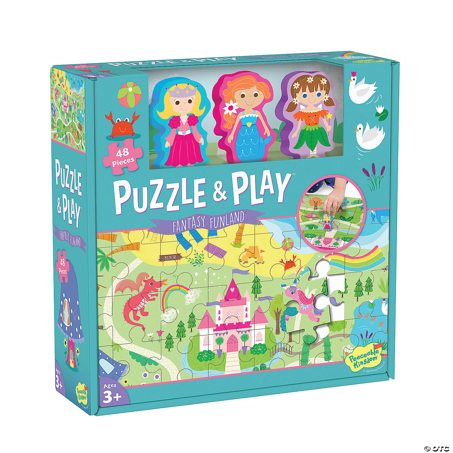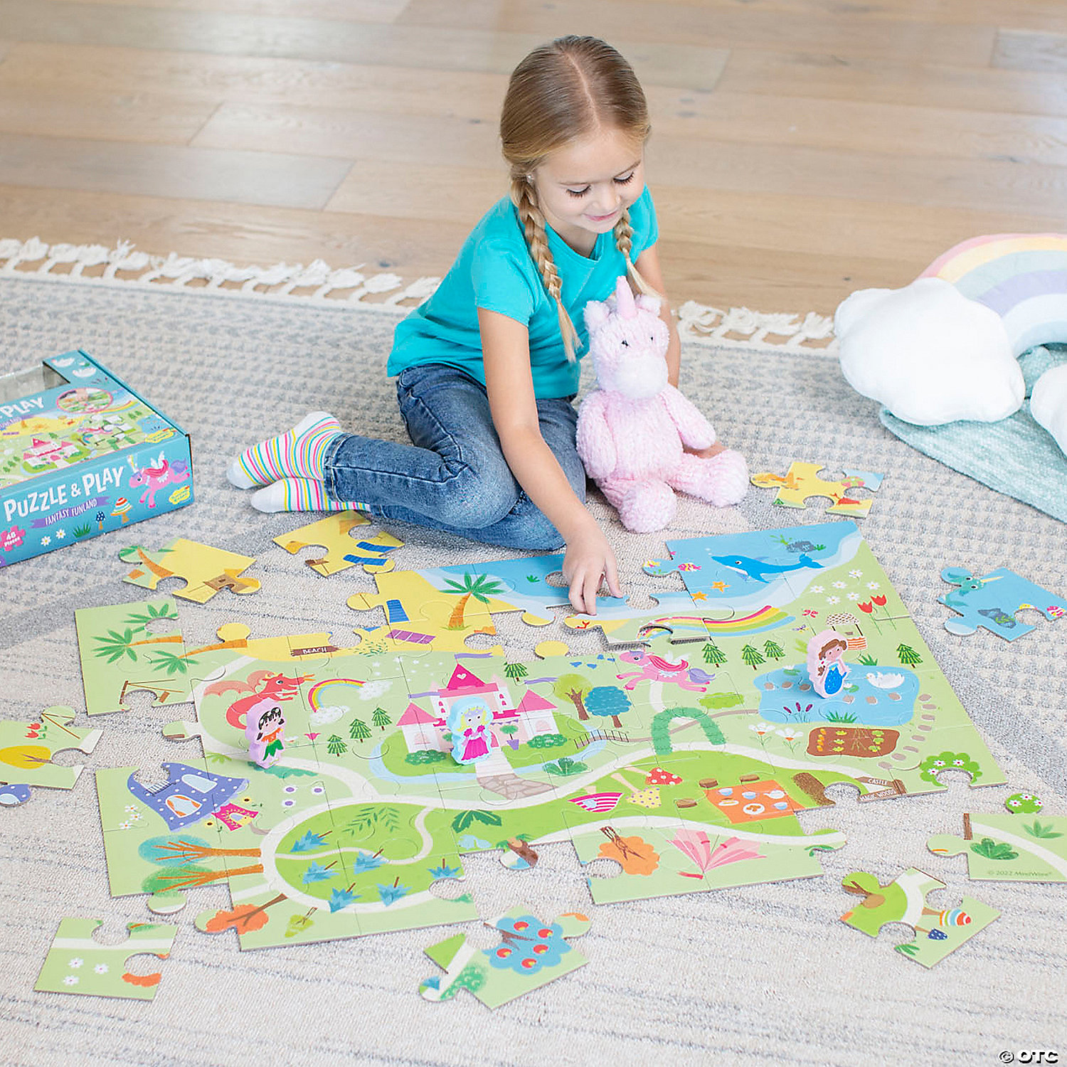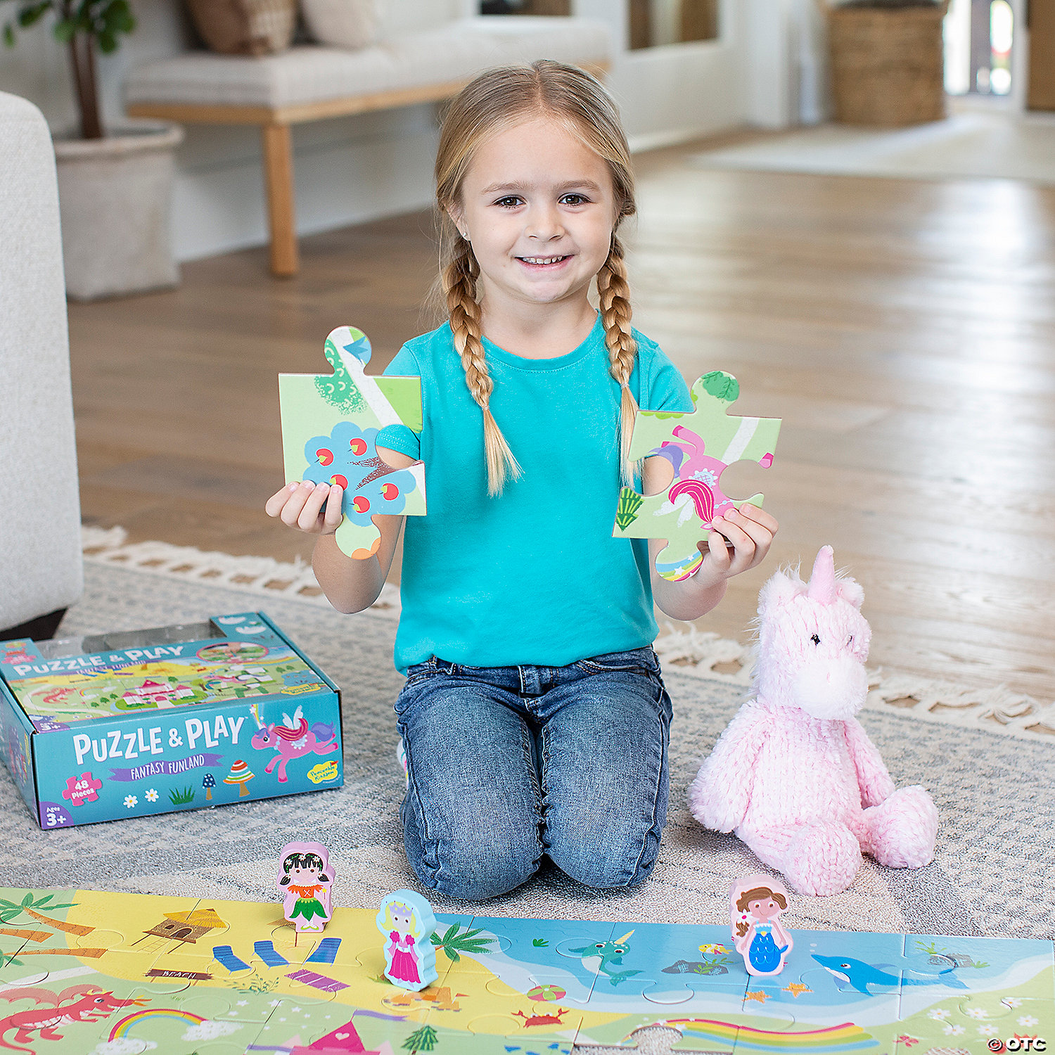 Imagine the possibilities with this high-quality two-in-one activity! First, young ones can piece together this colorful fantasy land puzzle, then use it as a background to let their imaginations soar. Will their 3 friend figurines—a princess, mermaid and fairy—have fun playing on the sunny beach, inside the princess castle or in the magical mushroom meadow? The sky’s the limit with this imaginative play activity!• 48-piece puzzle• 3 wooden figurines—a princess, mermaid and fairy• Visual recognition, cooperation, fine motor development, problem solving and cognitive skills• Completed puzzle measures 26” x 36”