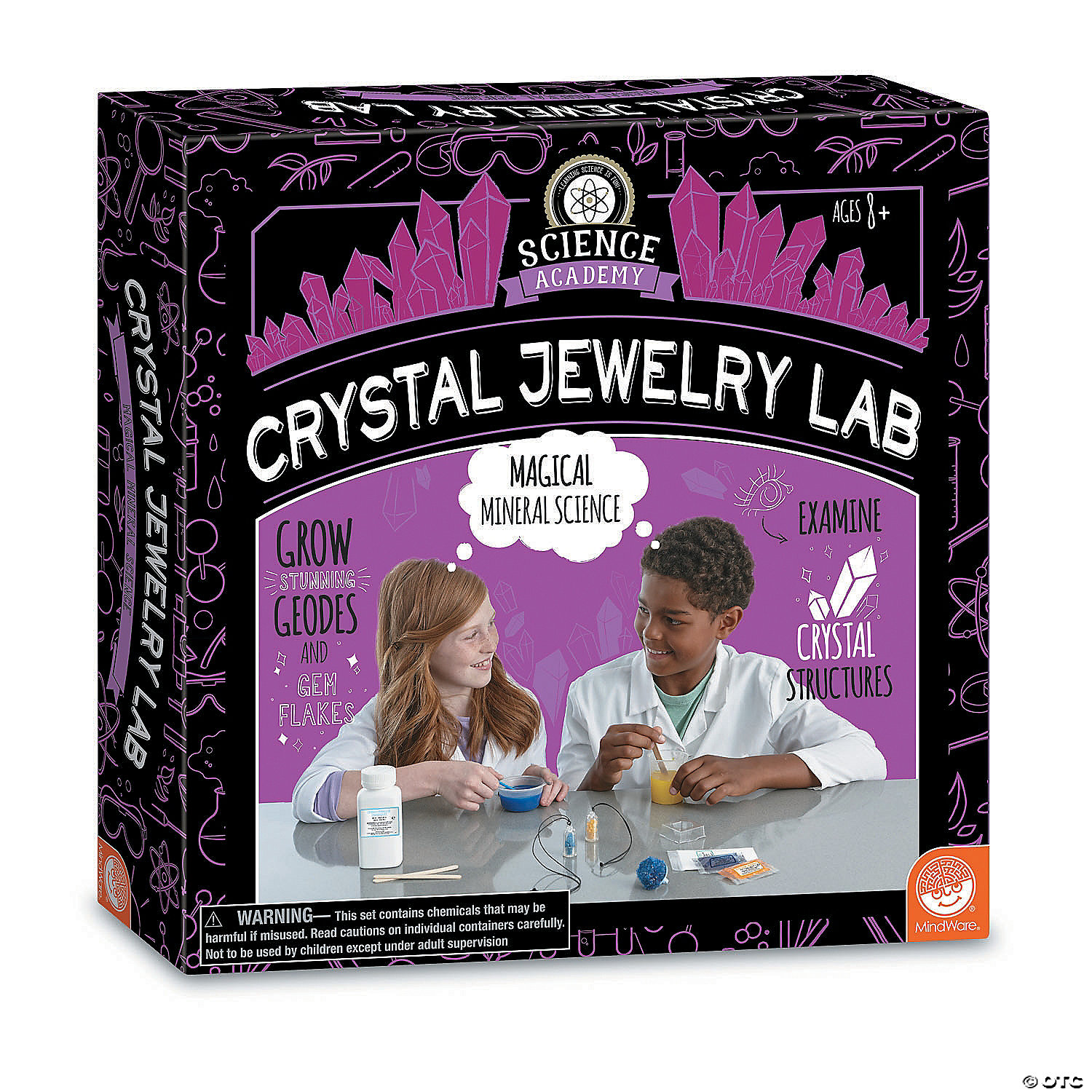 Do you have a curious kid who loves everything that sparkles? Some science experiments for kids shine brighter than the rest! Grow stunning geodes through the amazing process of crystallization with this brilliant lab activity. The kit includes all the science supplies needed, along with crystal clear, step-by-step instructions for dazzling gems worthy to be worn. Includes a ring and 2 pendant necklaces to display custom jewelry creations.• Create your own geode gem jewelry• A hands-on lesson in science for kids• Learn about the formation and growth of crystals• Includes a full-color instruction manual and supplies• Safety gloves are latex free