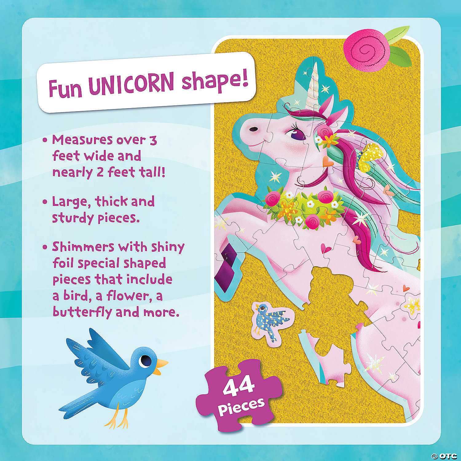 These adorably designed floor puzzles have shiny foil accents for extra fun. Puzzle pieces are thick and sturdy, with unique shapes for curious minds, including a butterfly, a star and more!• Develops visual recognition, fine-motor skills and problem-solving• Great for classrooms or at home• 44 Pieces • 1 puzzle approximately 2′ x 3′ once assembled, includes storage box with a corded handle for easy carrying.