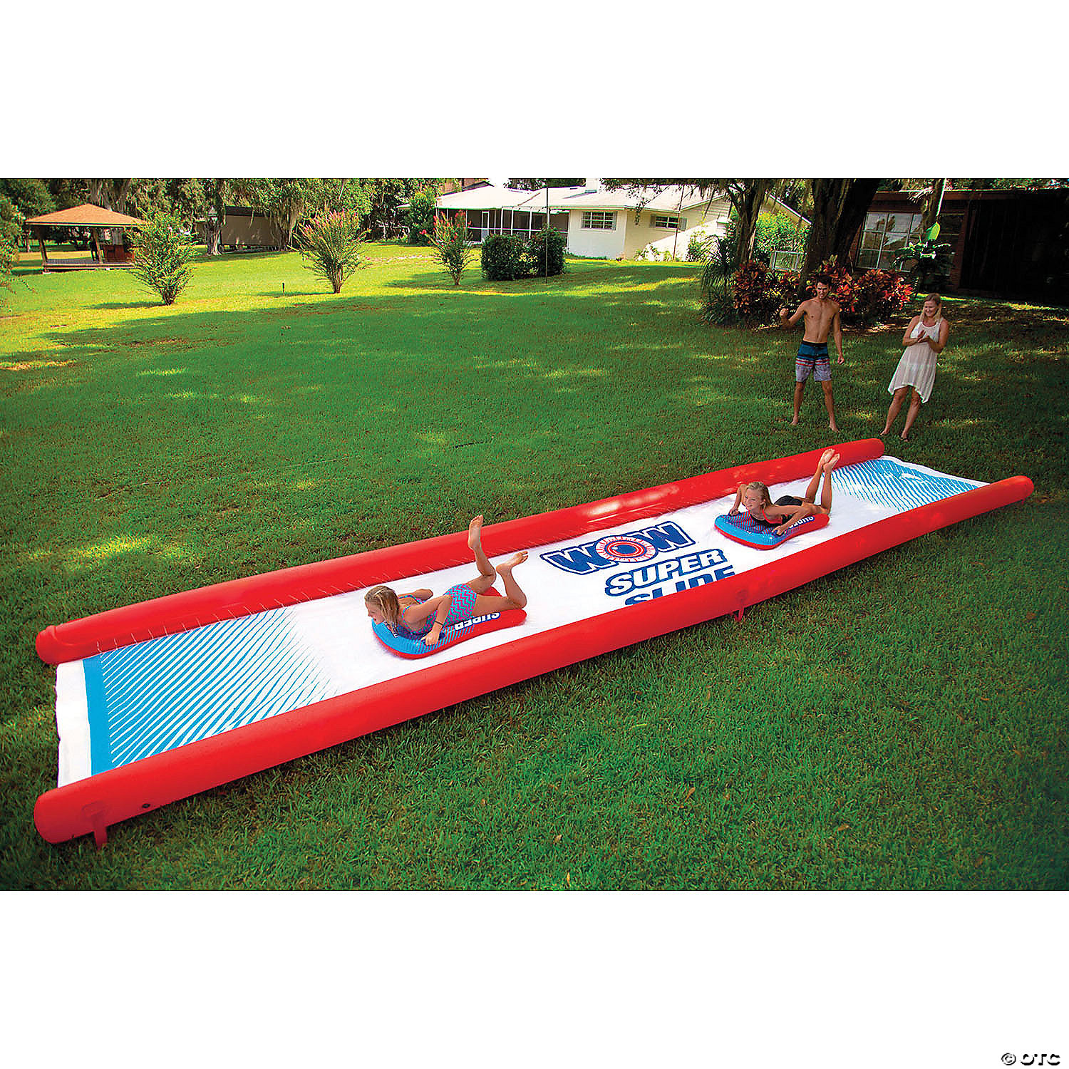 Looking for something special for your kid’s next backyard birthday party? We think we have the perfect party favor for you. The WOW Super Slide is a giant 25′ x 6′ water slide for the lawn that will keep the kids entertained all afternoon long. We got tired of all the cheap lawn water slides out there that were barely lucky to last a whole day, so we decided to build our own and back it by our WOW 1-year warranty. The WOW Super Slide is made from extra thick, heavy-duty, super-slick embossed PVC that will help you slip and slide all the way to the end. In fact, it is more than twice as thick as most of the slides you will find in the market. And no need to add dish soap to keep this slide slippery. Our zig-zag patterned, 25′ embedded sprinkler system, connects to the standard backyard hose, runs the length of the slide and has 100% water coverage so no dry spots. We also built it with sidewall pontoons to keep the water on the slide as well as your kids! Our favorite feature is the overlapping design, so you can purchase 2 or more slides and connect them all together for an even longer slide and twice the fun! Each slide comes with 2 Mega Sleds to cushion the fall and make the slide even more slippery. There, you now have everything you need to put on a great summer backyard party for your kids. Special Shipping Information: This item ships separately from other items in your order. This item cannot ship to a P.O. Box. This item may be subject to additional processing days. ITEM IS NOT ELIGIBLE FOR EXPEDITED SHIPPING
