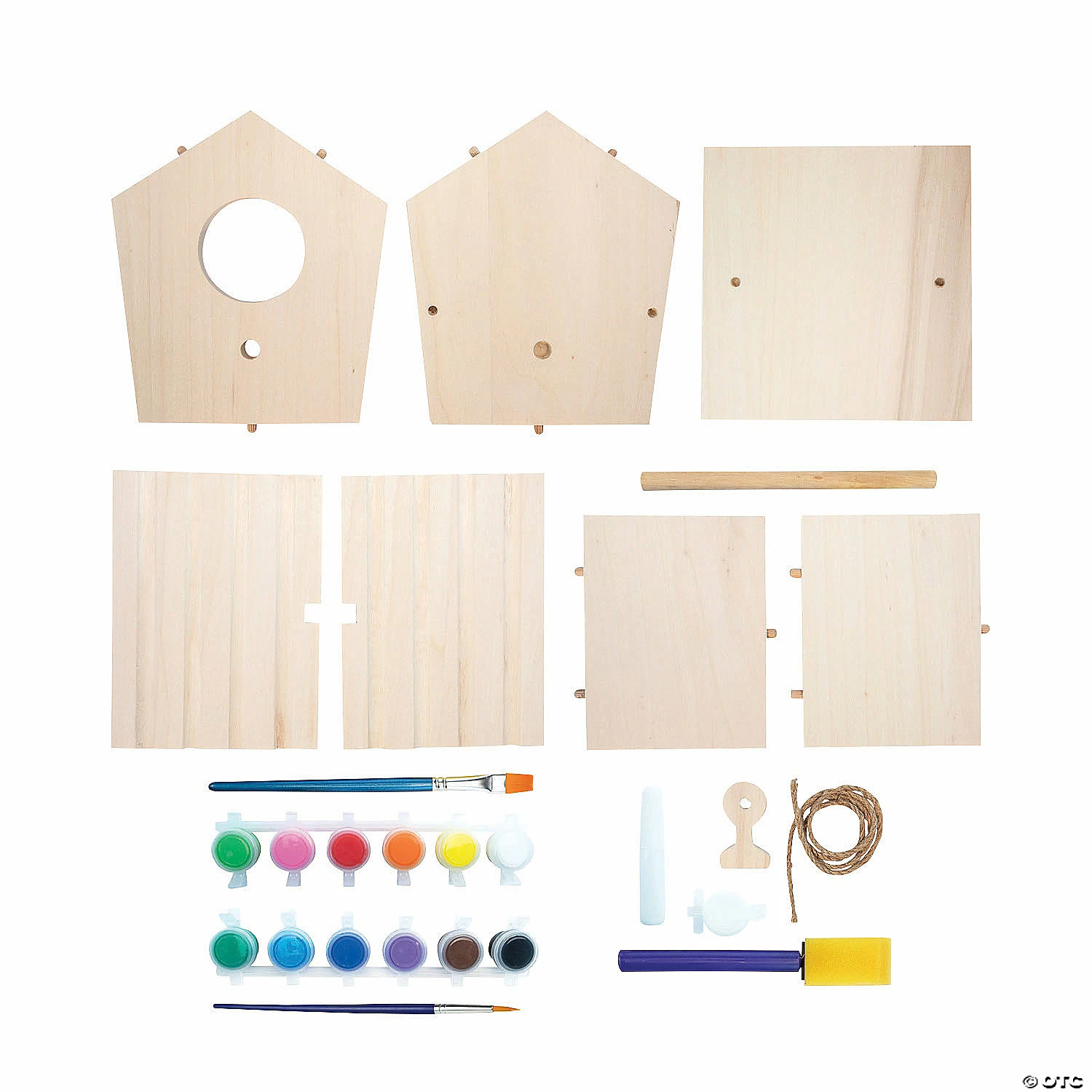 Invite local birds to your yard with a bird house you make and decorate yourself! Made of thick pine boards that slot together for easy construction, this sturdy birdhouse is designed for outdoor use. The full-color guide includes instructions, painting tips, and advice on how to attract birds to your birdhouse as well as facts about the birds that you may see.• An outdoorsy MYO craft that can be enjoyed year-round• Sparks interest in bird watching and natural science• Engages creativity, fine motor skills and DIY building basics• Sturdy pine construction for long-lasting final product measuring approximately 8” wide x 7” tall• Includes 9 solid-wood pre-cut birdhouse pieces, 13 paints, wooden hanging hook, twine, 2 paintbrushes, craft glue, instructions and guidebook
